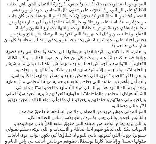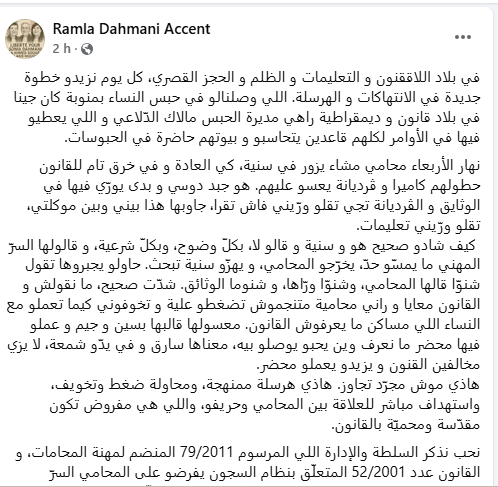 مضيفة في ذات التدوينة:” يوم الأربعاء زار المحامي سنية و في خرق تام للقانون تم وضع كاميرا و ڤرديانة يعسو عليهم. هو جبد دوسي و بدى يورّي فيها في الوثايق و الڤرديانة تجي تقلو ورّيني فاش تقرا، جاوبها هذا بيني وبين موكلتي، تقلو ورّيني تعليمات” كيف شادو صحيح هو و سنية و قالو لا، بكلّ وضوح، وبكلّ شرعية، و قالولها السرّ المهني ما يمسّو حدّ، يخرّجو المحامي، و يهزّو سنية تبحث”.