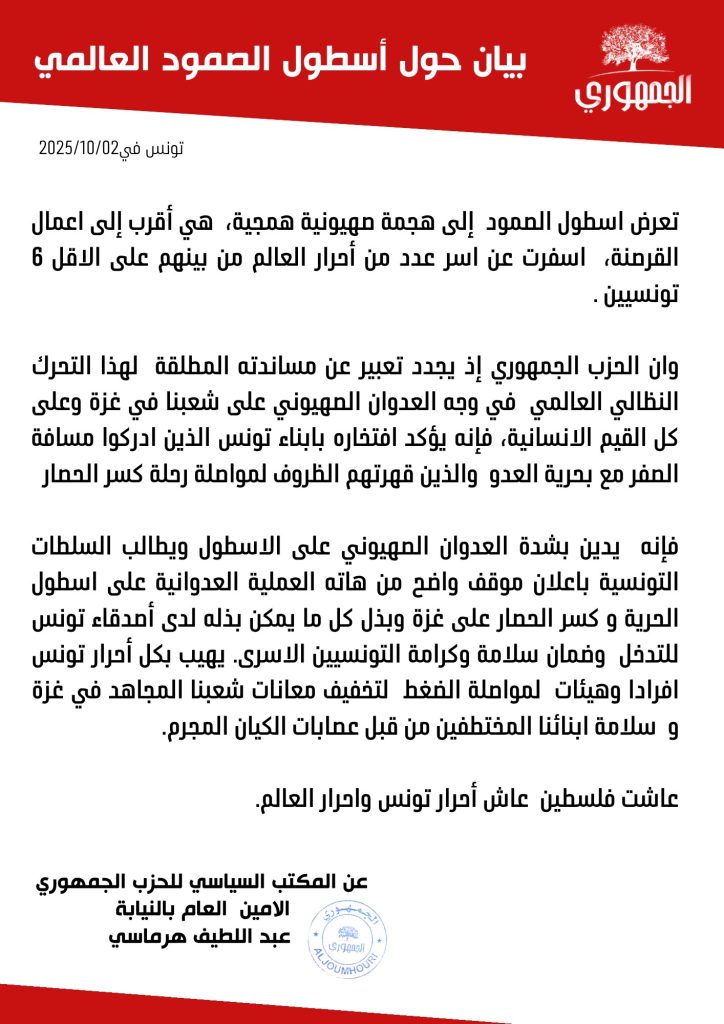 أدان الحزب الجمهوري بشدة في بلاغ له صباح اليوم الخميس 2 أكتوبر 2025 يدين العدوان الصهيوني على اسطول الصمود العالمي من أجل كسر الحصار عن غزة