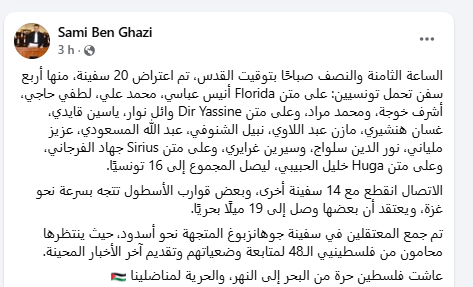 وقال بن عازي إنه تم اعتراض 20 سفينة، منها أربع سفن تحمل تونسيين: على متن Florida أنيس عباسي، محمد علي، لطفي حاجي، أشرف خوجة، ومحمد مراد، وعلى متن Dir Yassine وائل نوار، ياسين قايدي، غسان هنشيري، مازن عبد اللاوي، نبيل الشنوفي، عبد الله المسعودي، عزيز ملياني، نور الدين سلواج، وسيرين غرايري، وعلى متن Sirius جهاد الفرجاني، وعلى متن Huga خليل الحبيبي، ليصل المجموع إلى 16 تونسيًا.