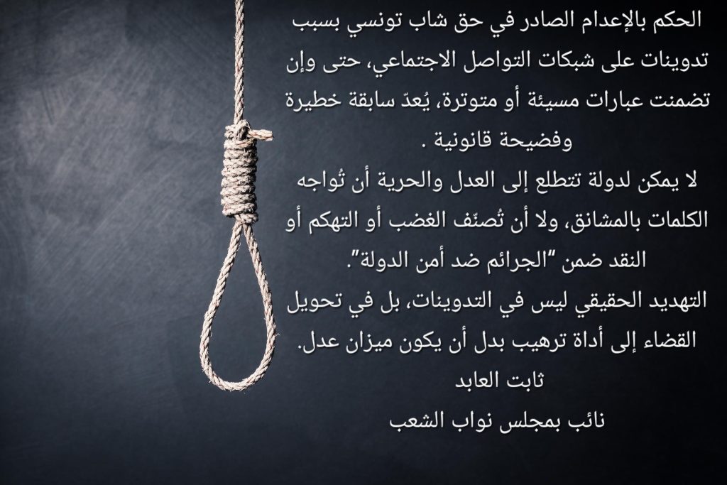قال النائب بالبرلمان ثابت العابد إن الحكم بالإعدام الصادر في حق شاب تونسي بسبب تدوينات على شبكات التواصل الاجتماعي، حتى وإن تضمنت عبارات مسيئة أو متوترة، يُعد سابقة خطيرة وفضيحة قانونية.