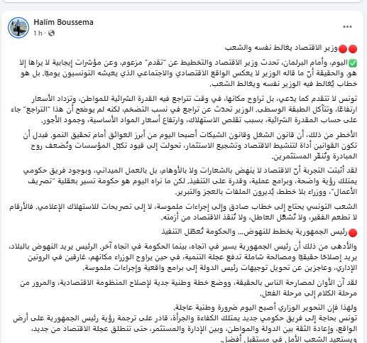 قال النائب بالبرلمان حليم بوسمة إن "رئيس الجمهورية قيس سعيد يسير ي اتجاه، بينما الحكومة في اتجاه آخر. الرئيس يريد النهوض بالبلاد، يريد إصلاحًا حقيقيًا ومصالحة شاملة تدفع عجلة التنمية، في حين يراوح الوزراء مكانهم، غارقين في الروتين الإداري، وعاجزين عن تحويل توجيهات رئيس الدولة إلى برامج واقعية وإجراءات ملموسة".