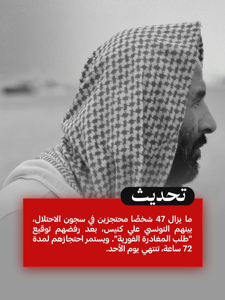 واضاف الأسطول أنه ما يزال 47 شخصًا محتجزين في سجون الاحتلال، من بينهم التونسي علي كنيس، بعد رفضهم توقيع “طلب المغادرة الفورية”. ويتيح هذا الرفض للاحتلال احتجازهم لمدة 72 ساعة (ثلاثة أيام)، على أن تنتهي الـ72 ساعة يوم الأحد.