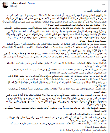 وتابع خالد في تدوينة له “البراءة المتأخرة من سجن مستعجل حين تصدر بعد سنواتٍ من الأسر، لا تُعيد الزمن، ولن تُطهّر الذاكرة.هي ليست تصحيحًا قانونيًا فحسب، هي بكل بساطة اعترافٌ متأخّر بأنّ الخوف قد انتصر على العدالة”.