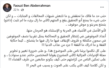في سياق متصل علق الوزير الأسبق فوزي بن عبد الرحمان في تدوينة له قائلا: “الأصل في الأشياء هي الحرية و الإستثناء هو الحرمان منها”، لا مانع أن تتم التحقيقات والمتهم حر طالما لم تثبت إدانته.