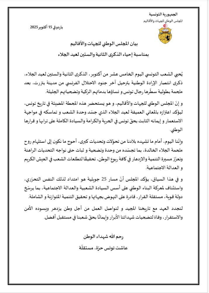 وأضاف المجلس في بيان أصدره الأربعاء 15 أكتوبر، أنّ مسار 25 جويلية هو امتداد لذلك النفس التحرّري، واستئناف لمعركة البناء الوطني على أسس السيادة الشعبية والعدالة الاجتماعية، بما يرسّخ دولة قوية، مستقلة القرار، قادرة على النهوض بجهاتها وتحقيق التنمية المتوازنة والشاملة.