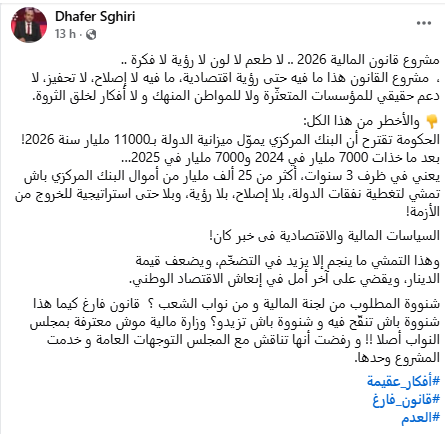 وأضاف الصغيري أن مشروع القانون لا رؤية اقتصادية فيه ولا إصلاح، لا تحفيز، لا دعم حقيقي للمؤسسات المتعثّرة ولا للمواطن المنهك و لا أفكار لخلق الثروة، وفق قوله.