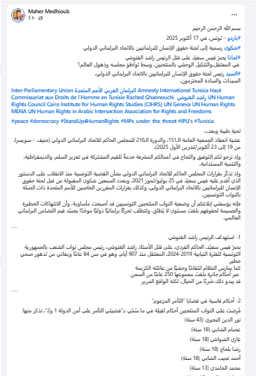 توجه النائب السابق بالبرلمان ماهر مذيوب بشكوى رسمية إلى لجنة حقوق الإنسان للبرلمانيين بالاتحاد البرلماني الدولي قال فيها إن “وضعية النواب المنتخبين التونسيين قد أصبحت مأساوية، وإن الانتهاكات الخطيرة والجسيمة لحقوقهم بلغت مستوى لا يُطاق”.