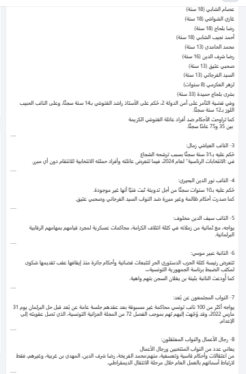 وأشار مذيوب إلى أن “أكثر من 100 نائب تونسي محاكمة غير مسبوقة بعد عقدهم جلسة عامة عن بُعد قبل حل البرلمان يوم 31 مارس 2022، وقد وُجّهت إليهم تهم بموجب الفصل 72 من المجلة الجزائية التونسية، الذي تصل عقوبته إلى الإعدام”.