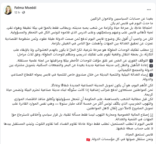 اعتبرت النائبة بالبرلمان فاطمة المسدي أن قابس اليوم تدفع ثمن صمت الدولة طيلة عقود، وثمن منظومة اقتصادية عجزت عن تحقيق العدالة بين الجهات وأهملت حقّ الناس في العيش بكرامة.