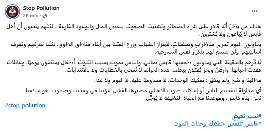 وتأتي هذه المسيرةٌ مواصلةً للحراك الشعبي الثابت، وتأكيدًا على مطلب تفكيك الوحدات الملوِّثة وإجلاء الخطر المحدق بڨابس.