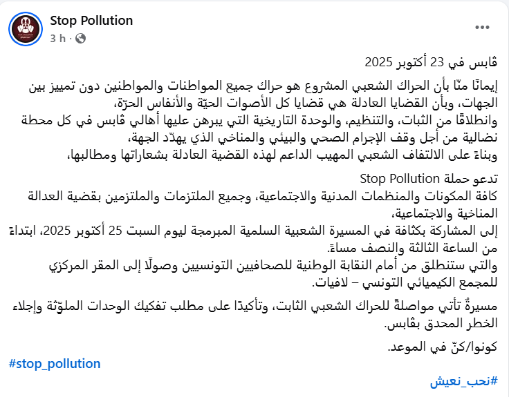 ومن جهة أخرى، دعت حملة Stop Pollutio كافة المكونات والمنظمات المدنية والاجتماعية، وجميع الملتزمات والملتزمين بقضية العدالة المناخية والاجتماعية، إلى المشاركة بكثافة في المسيرة الشعبية السلمية المبرمجة ليوم السبت 25 أكتوبر 2025، ابتداءً من الساعة الثالثة والنصف مساءً والتي ستنطلق من أمام النقابة الوطنية للصحافيين التونسيين وصولًا إلى المقر المركزي للمجمع الكيميائي التونسي – لافيات.