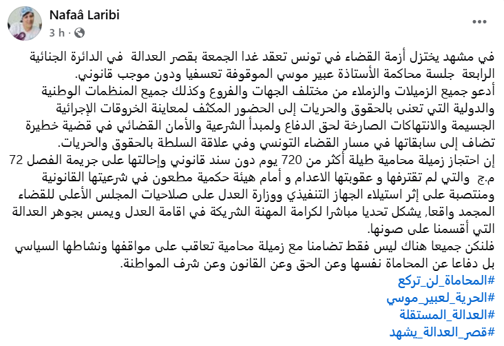 وأضاف العريبي “إن احتجاز محامية طيلة أكثر من 720 يوم دون سند قانوني وإحالتها على جريمة الفصل 72 م.ج والتي لم تقترفها و عقوبتها الإعدام و أمام هيئة حكمية مطعون في شرعيتها القانونية ومنتصبة على إثر استيلاء الجهاز التنفيذي ووزارة العدل على صلاحيات المجلس الأعلى للقضاء المجمد واقعا، يشكل تحديا مباشرا لكرامة المهنة الشريكة في اقامة العدل ويمس بجوهر العدالة التي أقسمنا على صونها”.