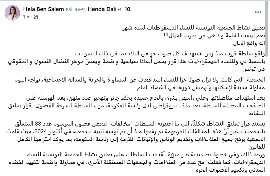 وأوضحت بن سالم، في تدوينة نشرتها على الفايسبوك، أنّ “قرار التعليق يستند شكليًّا إلى ما اعتبرته السلطات “مخالفات” لبعض فصول المرسوم عدد 88 المتعلق بالجمعيات” مشددة على أن هذه ”المخالفات المزعومة تمّت تسويتها منذ توجيه تنبيه للجمعية في أكتوبر 2024، حيث قدّمت الأخيرة جميع الوثائق والإثباتات المطلوبة إلى رئاسة الحكومة، بما يؤكّد احترامها التام للقانون”.