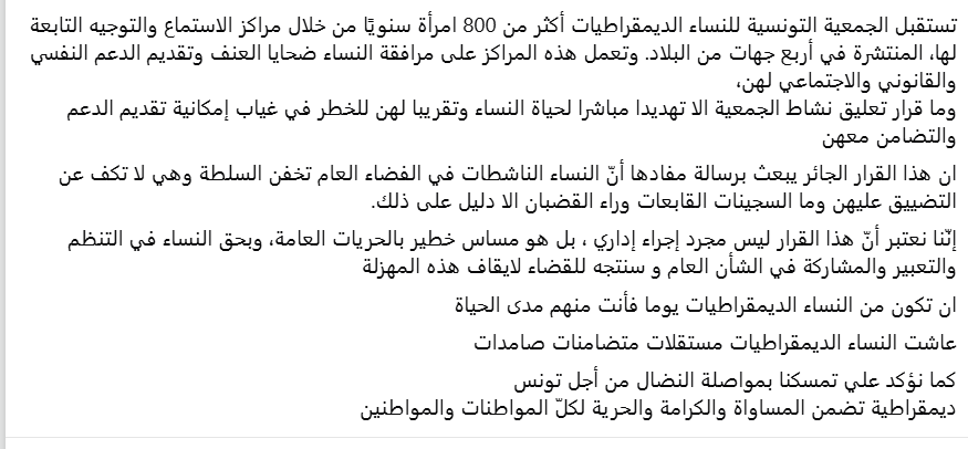 وأضافت أنّه رغم ذلك، أقدمت السلطات في خطوة تصعيدية غير مبرّرة على تعليق نشاط الجمعية، على غرار ما حدث مع عدد من المنظمات والجمعيات المستقلة الأخرى، معتبرةً أنّ ذلك محاولة لتقييد الفضاء المدني و تكميم الأصوات الحرة.