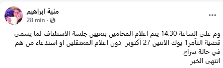 أفادت منية ابراهيم النائبة السابقة وزوجة المعتقل السياسي عبد الحميد الجلاصي بأنه “تم تعيين جلسة الاستئناف لما يعرف بقضية التآمر على أمن الدولة 1 يوم الإثنين 27 أكتوبر دون إعلام المعتقلين أو استدعاء من هم في حالة سراح”.
