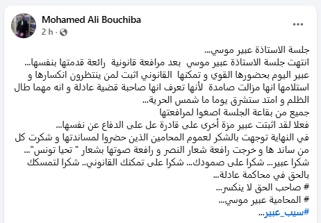 وكان المحامي محمد علي بوشيبة قد أكد في تدوينة نشرها على صفحته بالفيسبوك ترافع موسي عن نفسها خلال جلسة اليوم قائلا إن “حضورها القوي و تمكنها القانوني اثبت لمن ينتظرون انكسارها و استلامها انها مزالت صامدة لأنها تعرف انها صاحبة قضية عادلة و انه مهما طال الظلم و امتد ستشرق يوما ما شمس الحرية”.