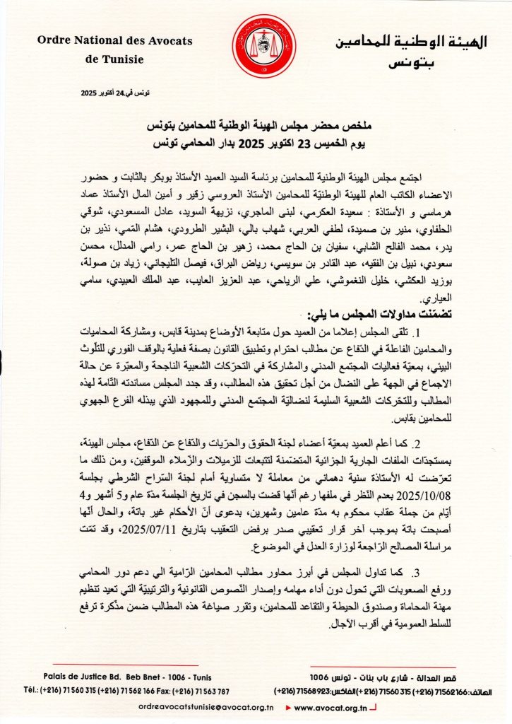 وأشارت الهيئة إلى أنه لم بتم النظر في ملفها رغم أنها قضت بالسجن في تاريخ الجلسة مدة عام و 5 أشهر و4 أيام من جملة عقاب محكوم به مدة عامين وشهرين، بدعوى أن الأحكام غير باتة، والحال آنها أصبحت باتة بموجب آخر قرار تعقيبي صدر برفض التعقيب بتاريخ 2025/07/11، وفق ما جاء ملخص محضر مجلس الهيئة الوطنية للمحامين بتونس يوم الخميس 23 اكتوبر 2025.