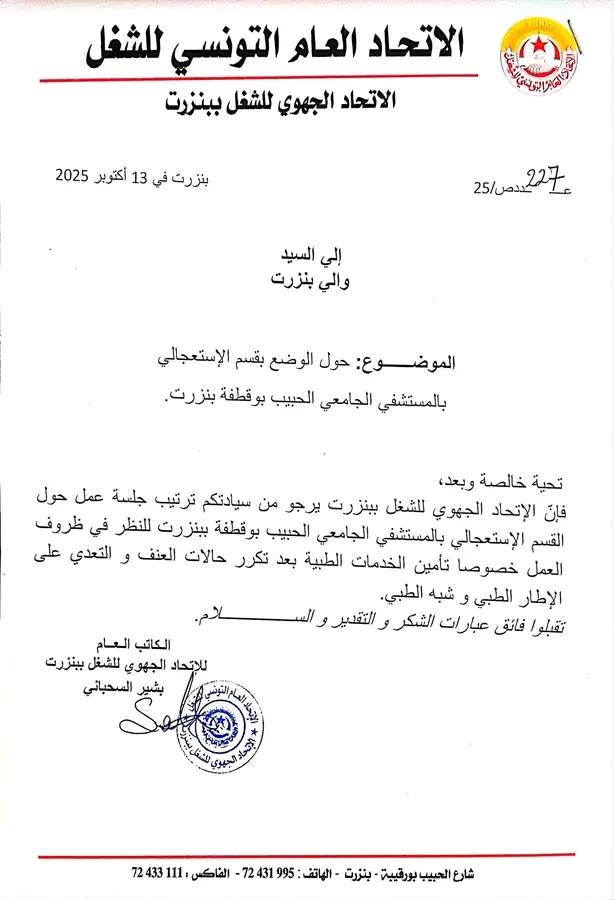 وأفاد الكاتب العام الجهوي للشغل ببنزرت البشير السحباني، في تدوينة على فيسبوك، بأن الدكتور بولبابة مخلوف عدّد النقائص التي يشكو منها المستشفى.
