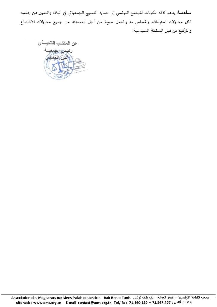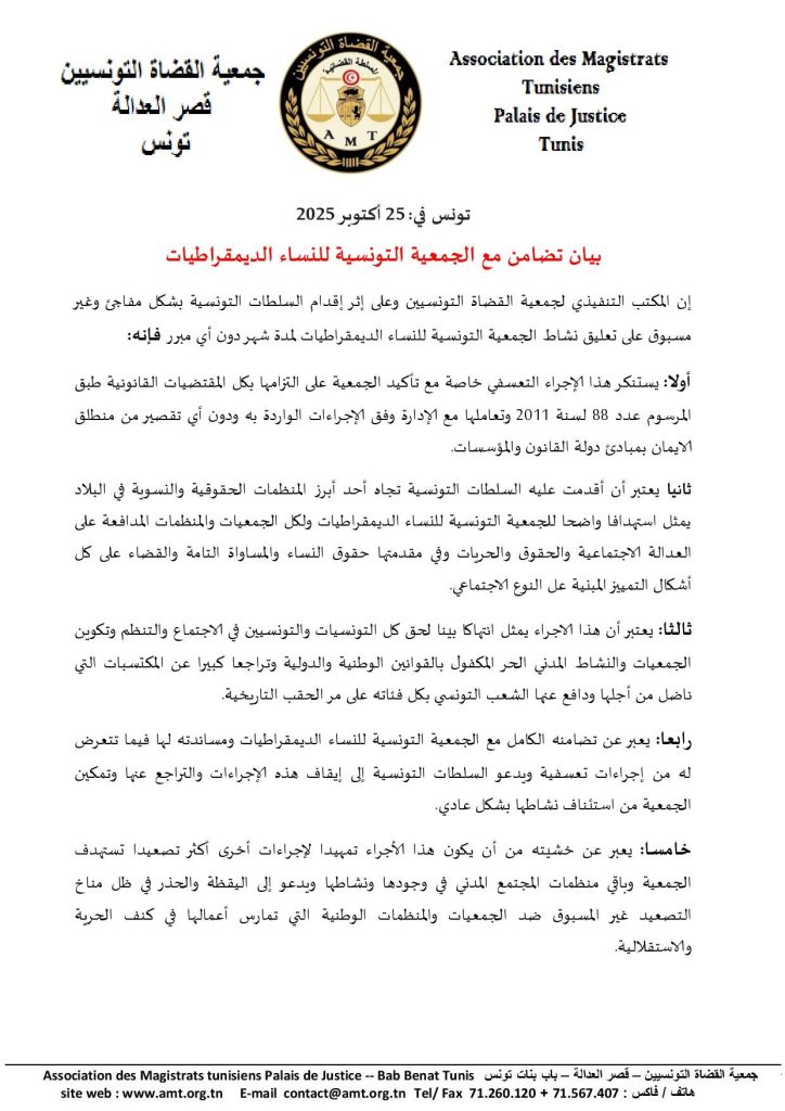 كما عبرت جمعية القضاة التونسيين عن تضامنها الكامل مع الجمعية التونسية للنساء الديمقراطيات ومساندتها لها فيما تتعرض له “من إجراءات تعسفية” داعية السلطات التونسية إلى إيقاف هذه الإجراءات والتراجع عنها وتمكين الجمعية من استئناف نشاطها بشكل عادي.