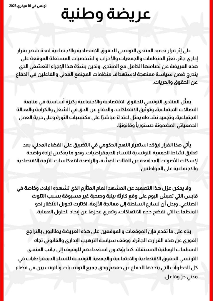 وأدان الموقعون على العريضة هذا الإجراء التعسّفي وقالوا إنه ” يندرج ضمن سياسة ممنهجة لاستهداف منظمات المجتمع المدني والفاعلين في الدفاع عن الحقوق والحريات”.