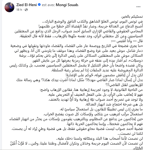 وتابع في ذات التدوينة: لا يوجد في تصريح أحمد صواب نيّة إرهابية ولا أيُّ تهديد بالعنف بل هي صرخة احتجاج ضد انهيار العدالة.