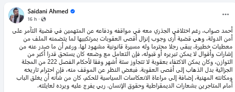 وأضاف سعيداني: “بغض النظر عن الموقف منه، فإن احترام تاريخه ومكانته المهنية، إضافة إلى مراعاة الانعكاسات السياسية للحكم، كان من شأنه أن يغلق الباب أمام المتاجرين بشعارات الديمقراطية وحقوق الإنسان” وفق تعبيره.