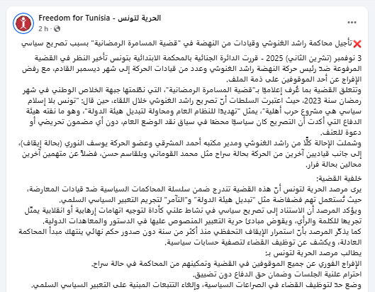 وذكر مرصد الحرية لتونس في بيان له بأن “استمرار الإيقاف التحفظي منذ أكثر من سنة دون صدور حكم نهائي ينتهك مبدأ المحاكمة العادلة، ويكشف عن توظيف القضاء لتصفية حسابات سياسية”.