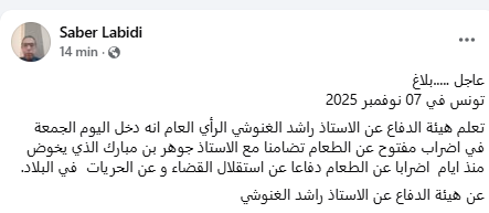 أفادت هيئة الدفاع عن رئيس حركة النهضة راشد الغنوشي بأنه دخل بداية من اليوم الجمعة 7 نوفمبر 2025 في اضراب مفتوح عن الطعام تضامنا مع المعتقل السياسي جوهر بن مبارك
