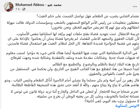 وأضاف عبو في تدوينة له أن “تاريخ هذه البلاد ارتبط بالظلم وبالرضوخ والتطبيع مع الظالم”.