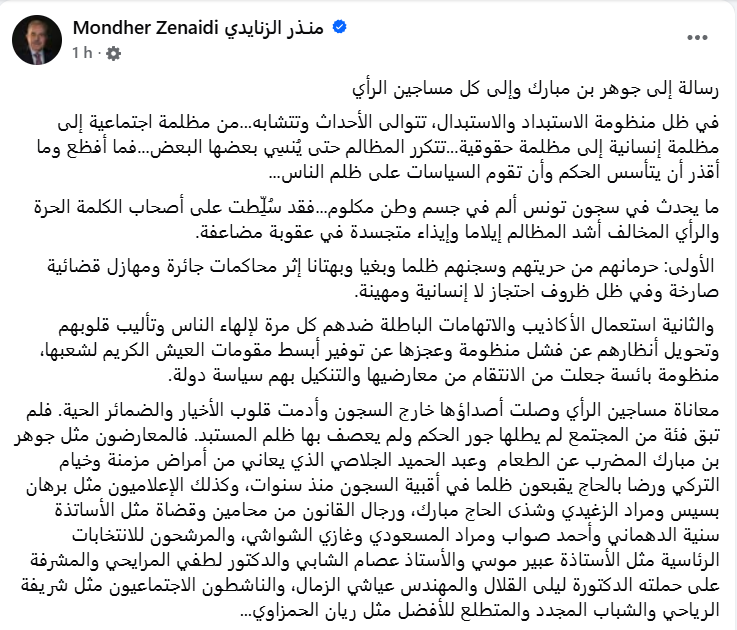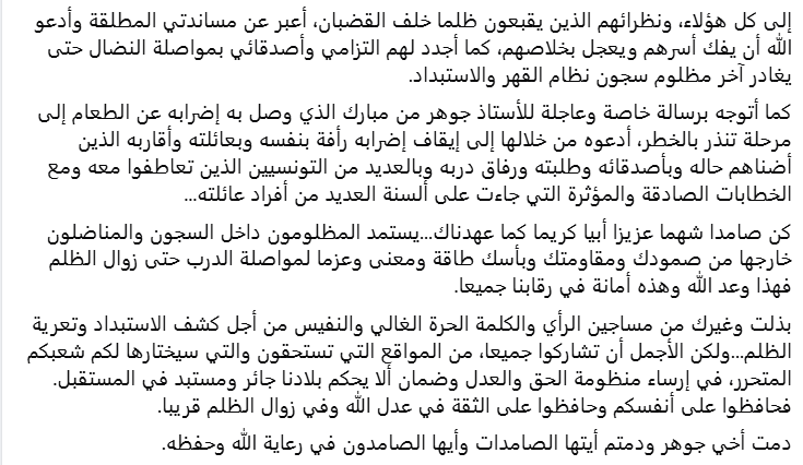 وتوجه الزنايدي لجوهر بن مبارك قائلا “كن صامدا شهما عزيزا أبيا كريما كما عهدناك…يستمد المظلومون داخل السجون والمناضلون خارجها من صمودك ومقاومتك وبأسك طاقة ومعنى وعزما لمواصلة الدرب حتى زوال الظلم فهذا وعد الله وهذه أمانة في رقابنا جميعا” داعيا إياه الى ايقاف اضرابه عن الطعام “رأفة بنفسه وبعائلته وأقاربه الذين أضناهم حاله وبأصدقائه وطلبته ورفاق دربه وبالعديد من التونسيين الذين تعاطفوا معه ومع الخطابات الصادقة والمؤثرة التي جاءت على ألسنة العديد من أفراد عائلته”.