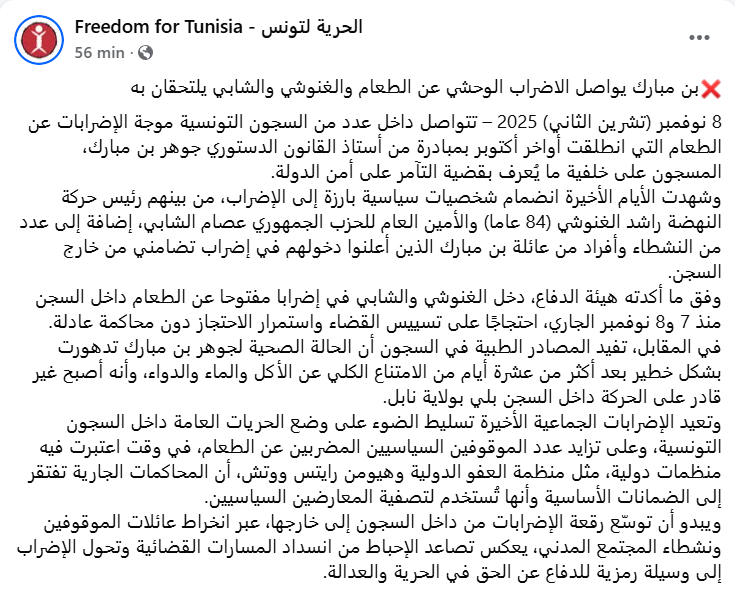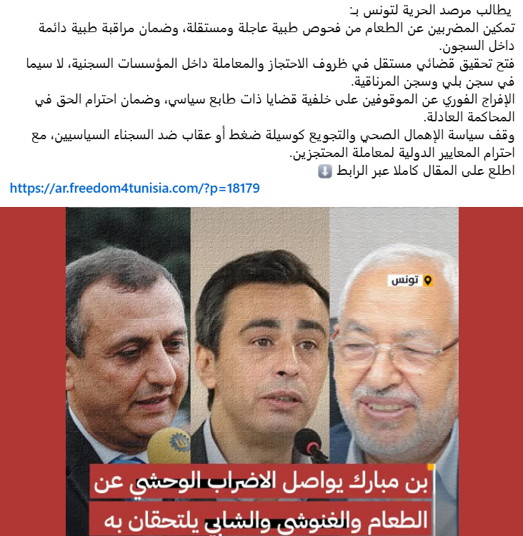 وأكد المرصد في بيان له تواصل موجة الإضرابات عن الطعام التي انطلقت أواخر أكتوبر بمبادرة من جوهر بن مبارك، المسجون على خلفية ما يُعرف بقضية التآمر على أمن الدولة، إضافة الى دخول رئيس حركة النهضة راشد الغنوشي والأمين العام للحزب الجمهوري عصام الشابي في إضراب مفتوح عن الطعام داخل السجن منذ 7 و8 نوفمبر الجاري، احتجاجًا على تسييس القضاء واستمرار الاحتجاز دون محاكمة عادلة.