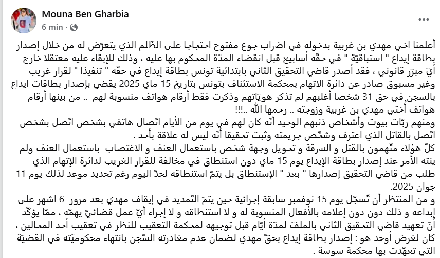 وبينت منى بن غربية في تدوينة نشرتها عبر الفايسبوك، أن شقيقها المهدي بن غربية يتعرض الى “مظلمة” حيث تم “إصدار بطاقة إيداع “استباقيّة ” في حقّه أسابيع قبل انقضاء المدّة المحكوم بها عليه ، وذلك للإبقاء عليه معتقلا خارج أيّ مبرّر قانوني ، فقد أصدر قاضي التحقيق الثاني بابتدائية تونس بطاقة إيداع في حقّه “تنفيذا” لقرار غريب وغير مسبوق صادر عن دائرة الاتهام بمحكمة الاستئناف بتونس بتاريخ 15 ماي 2025 يقضي بإصدار بطاقات ايداع بالسجن في حق 31 شخصا أغلبهم لم تذكر هويّاتهم وذكرت فقط أرقام هواتف منسوبة لهم من بينها أرقام هواتف مهدي بن غربية وزوجته المتوفاة ومنهم ربّات بيوت وأشخاص ذنبهم الوحيد أنّه كان لهم في يوم من الأيام اتّصال هاتفي بشخص اتّصل بشخص اتّصل بالقاتل الذي اعترف وشخّص جريمته وثبت تحقيقا أنّه ليس له علاقة بأحد”، على حد قولها.