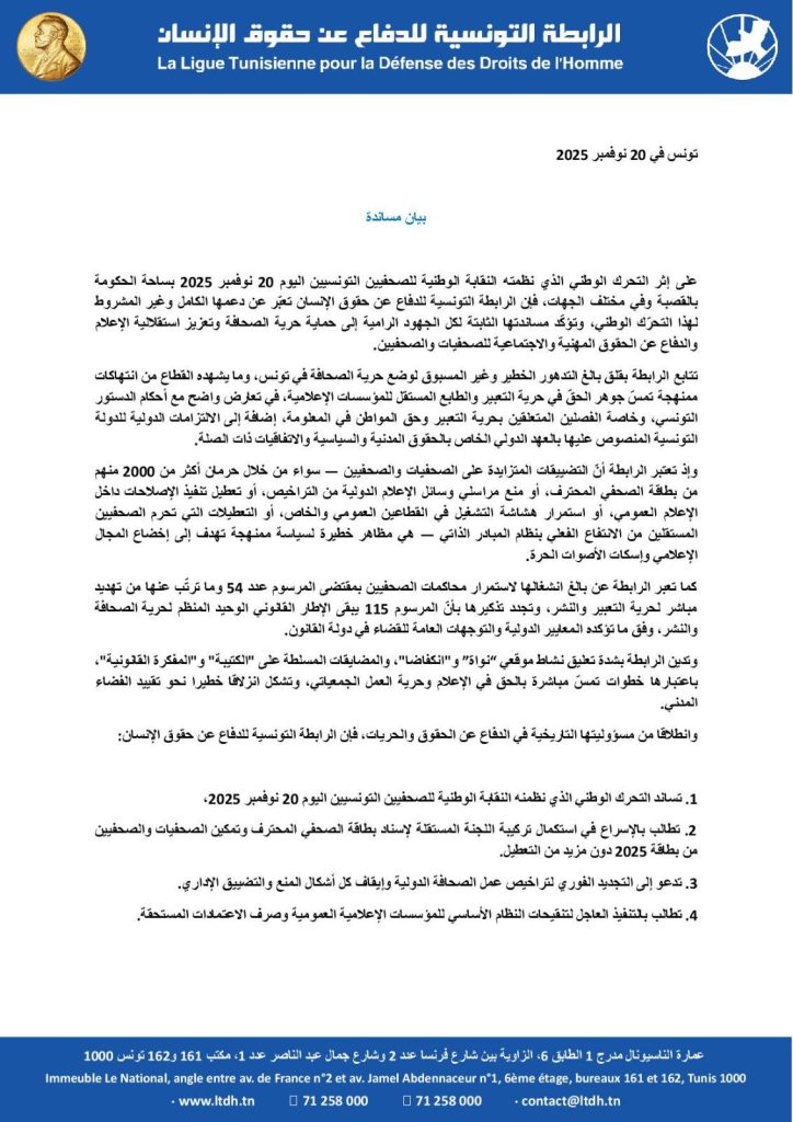 كما طالبت بالتنفيذ العاجل لتنقيحات النظام الأساسي للمؤسسات الإعلامية العمومية وصرف الاعتمادات المستحقة، مع تمكين الصحفيين المستقلين من الانتفاع الفعلي بنظام المبادر الذاتي وفق ما نص عليه قانون المالية لسنة 2025.