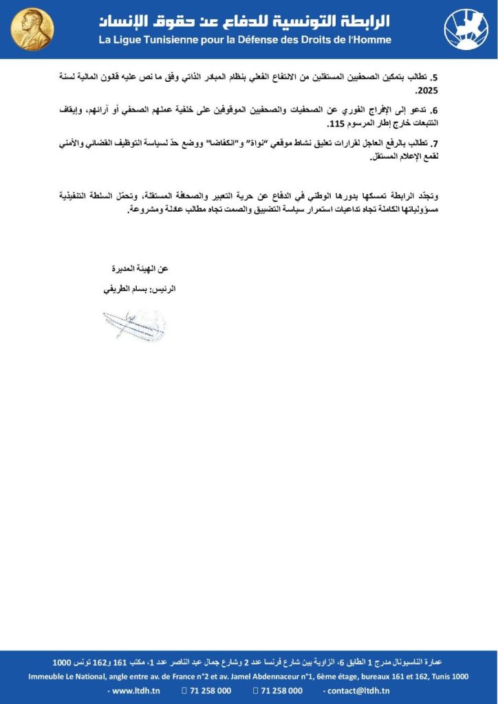 وعبرت الرابطة عن بالغ انشغالها لاستمرار محاكمات الصحفيين بمقتضى المرسوم عدد 54 وما ترتب عنها من تهديد مباشر لحرية التعبير والنشر، وتجدد تذكيرها بأن المرسوم 115 يبقى الإطار القانوني الوحيد المنظم لحرية الصحافة والنشر، وفق ما تؤكده المعايير الدولية والتوجهات العامة للقضاء في دولة القانون داعية إلى الإفراج الفوري عن الصحفيات والصحفيين الموقوفين على خلفية عملهم الصحفي أو آرائهم، وإيقاف التتبعات خارج إطار المرسوم 115.
