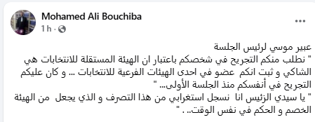 وقالت موسي لرئيس الجلسة وفق ما نقله المحامي محمد علي بوشيبة: “نطلب منكم التجريح في شخصكم باعتبار ان الهيئة المستقلة للانتخابات هي الشاكي و ثبت انكم عضو في احدى الهيئات الفرعية للانتخابات و كان عليكم التجريح في أنفسكم منذ الجلسة الأولى”.