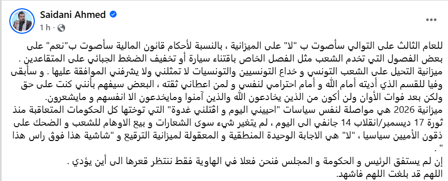 أكد النائب بالبرلمان أحمد سعيداني، اليوم الخميس 27 نوفمبر 2025، اعتزامه التصويت بـ “لا” على ميزانية الدولة لسنة 2026، معتبرا أن ميزانية 2026 هي مواصلة لنفس السياسات التي توختها كل الحكومات المتعاقبة منذ ثورة 17 ديسمبر إلى اليوم، وفق تعبيره.