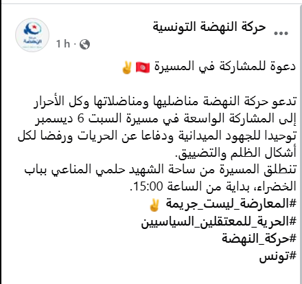 تنطلق المسيرة من ساحة الشهيد حلمي المناعي بباب الخضراء، بداية من الساعة 15:00.