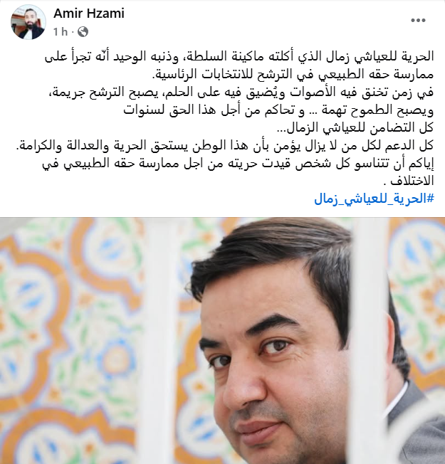 واعتبر الحزامي أن ذنب العياشي زمال الوحيد “أنّه تجرأ على ممارسة حقه الطبيعي في الترشح للانتخابات الرئاسية متابعا “في زمن تخنق فيه الأصوات ويُضيق فيه على الحلم، يصبح الترشح جريمة، ويصبح الطموح تهمة و تحاكم من أجل هذا الحق لسنوات”.