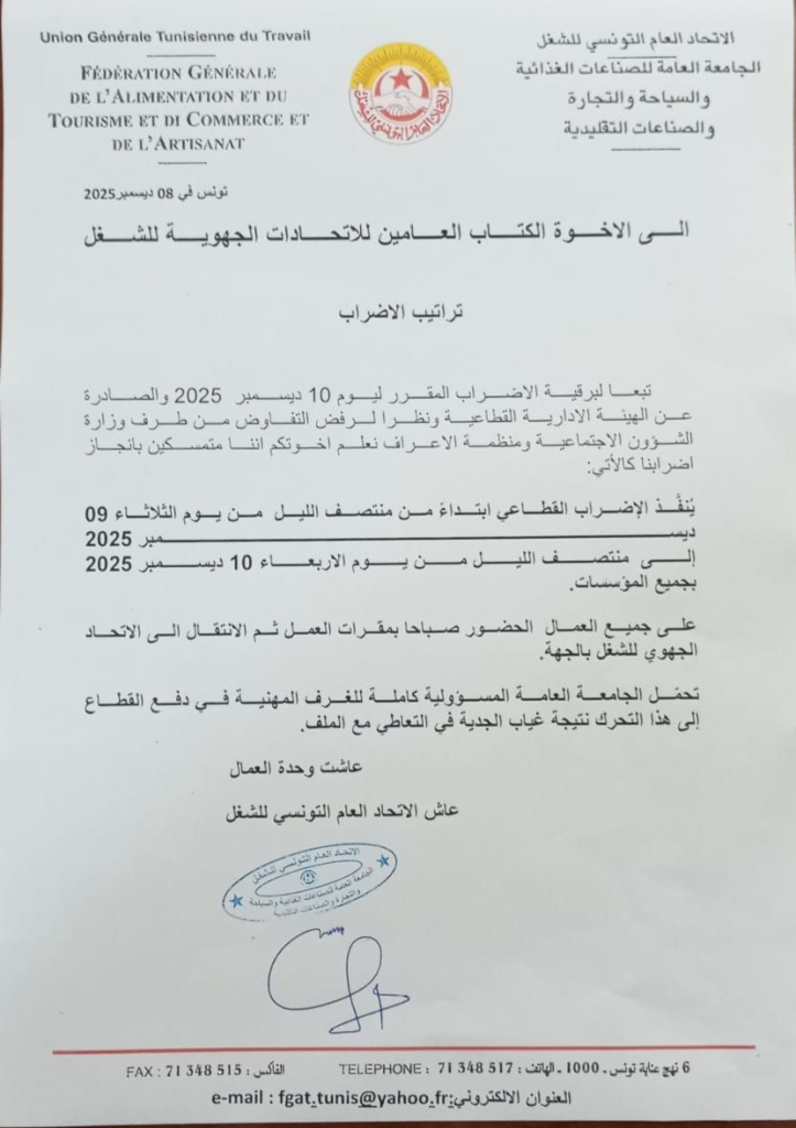 وأعلنت الجامعة العامة للصناعات الغذائية والسياحة والتجارة والصناعات التقليدية تمسّكها بتنفيذ إضراب عام غداً الأربعاء 10 ديسمبر، محملة المسؤولية الكاملة لهذا التحرك للغرف المهنية بسبب غياب الجدية في التعامل مع الملفات المطروحة.
