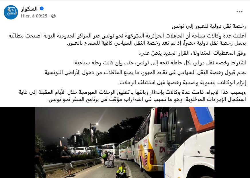 في حين أكدت بعض الصفحات الأخرى أن القرار يأتي نتيجة شروع السلطات الجزائرية في تطبيق إجراء جديد يقضي بفرض رخصة نقل دولية على جميع الحافلات المتوجّهة نحو الأراضي التونسية عبر المعابر البرّية، حيث أن رخصة النقل السياحي المعمول بها لسنوات أصبحت غير كافية للعبور.