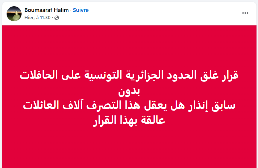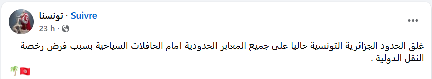 ونقلت بعض الصفحات على مواقع التواصل الاجتماعي، أن هذا القرار يأتي نتيجة الاكتظاظ على مستوى المعابر الحدودية، حيث تقرر غلق الحدود التونسية أمام الحافلات الجزائرية.