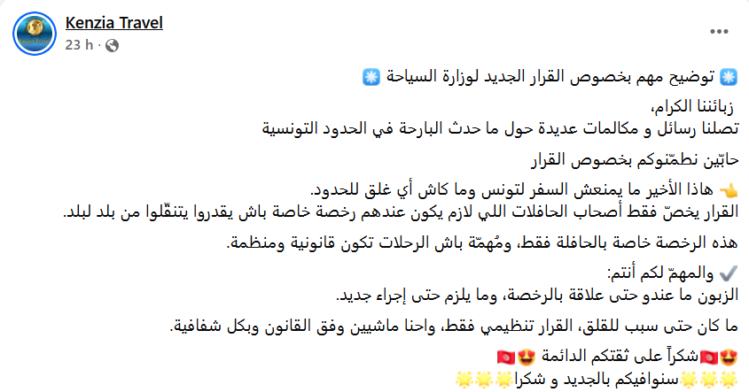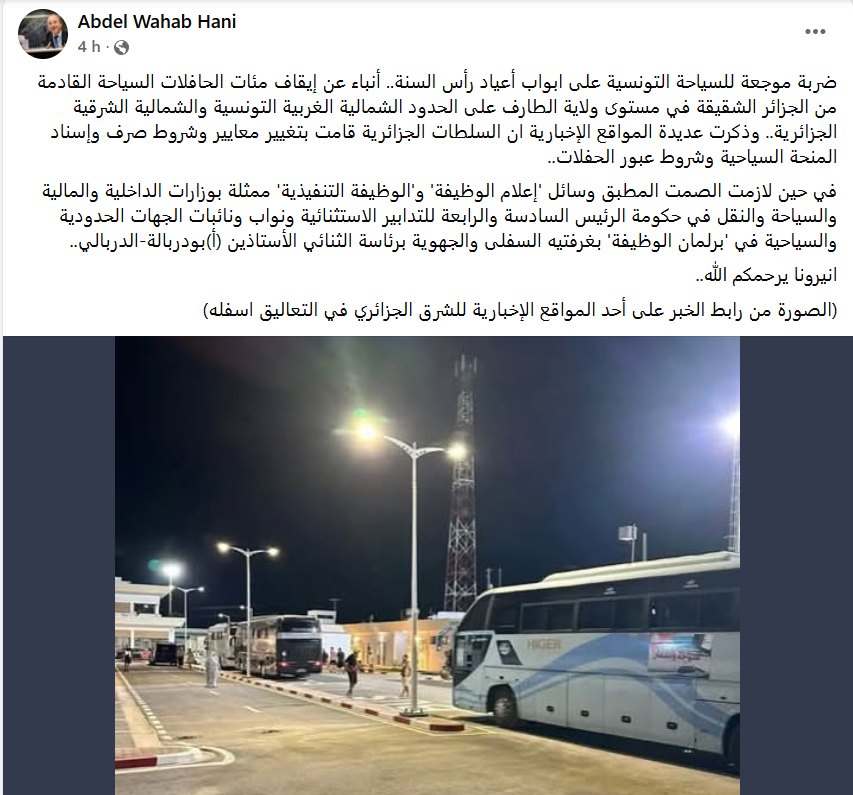 من جهته، نشر الناشط السياسي التونسي عبد الوهاب الهاني، اليوم الثلاثاء 09 ديسمبر 2025، تدوينة، إعتبر من خلالها، أن هذا القرار هو “ضربة موجعة للسياحة التونسية على أبواب أعياد رأس السنة”.