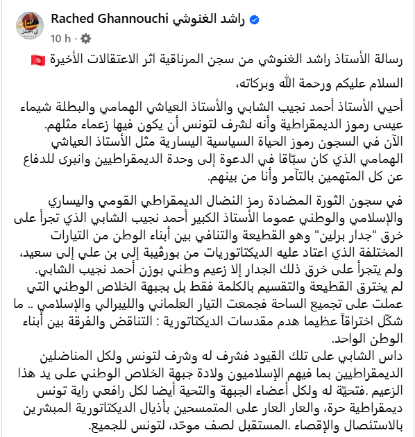 توجه رئيس حركة النهضة، راشد الغنوشي اليوم الأربعاء 12 ديسمبر 2025، برسالة من سجن ايقافه بالمرناقية، عبر من خلالها عن تضامنه مع كل من رئيس جبهة الخلاص الوطني أحمد نجيب الشابي والمحامي العياشي الهمامي والناشطة السياسية والحقوقية شيماء عيسى، ووصفهم بـ "رموز الديمقراطية".