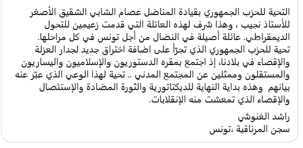 كما توجه الغنوشي بالتحية الى كل من عصام الشابي والى الحزب الجمهوري “الذي تجرّأ على اضافة اختراق جديد لجدار العزلة والإقصاء في بلادنا، إذ اجتمع بمقره الدستوريون والإسلاميون واليساريون والمستقلون وممثلين عن المجتمع المدني” متابعا “هذه بداية النهاية للديكتاتورية والثورة المضادة و الاستئصال والإقصاء الذي تمعشت منه الانقلابات”.
