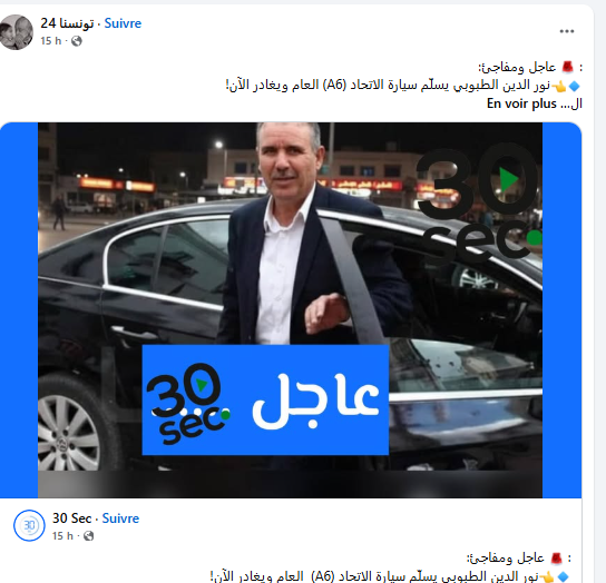 وبالتالي فإن ما يروج حول استقالة الأمين العام للاتحاد العام التونسي للشغل نور الدين الطبوبي هو خبر زائف لا أساس له من الصحة،