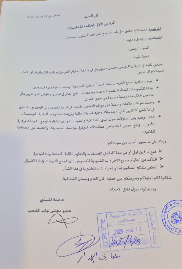 وطالبت المسدي بفتح تدقيق أولي أو مراجعة كاملة في الحسابات والتقارير المالية المتعلقة بهذه المبادرة، والتأكد من احترام جميع الإجراءات القانونية المنصوص عليها لجمع التبرعات وإدارة الأموال.