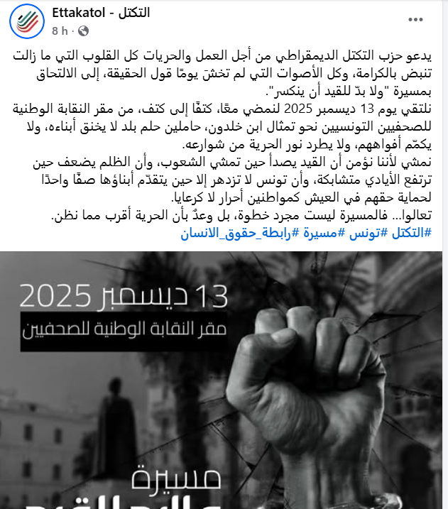 واعتبر الحزب في بيان له أن هذه “المسيرة ليست مجرد خطوة، بل وعدٌ بأن الحرية أقرب مما نظن” متابعا “نلتقي يوم 13 ديسمبر 2025 لنمضي معًا، كتفًا إلى كتف، من مقر النقابة الوطنية للصحفيين التونسيين نحو تمثال ابن خلدون، حاملين حلم بلد لا يخنق أبناءه، ولا يكمّم أفواههم، ولا يطرد نور الحرية من شوارعه”.