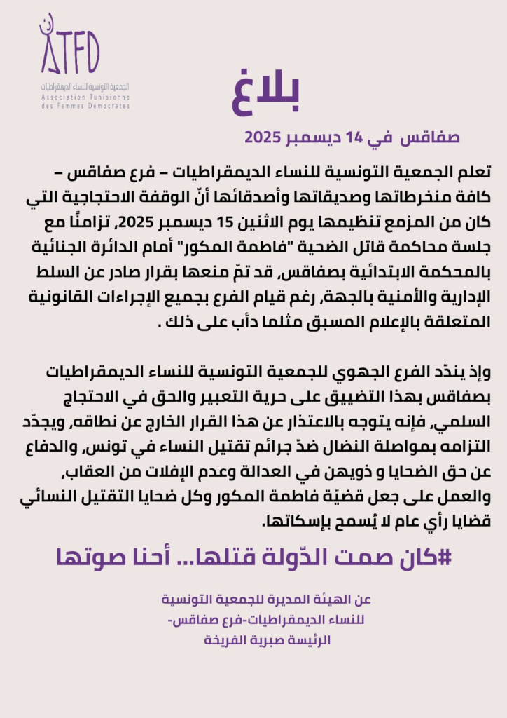 ونددت الجمعية بهذا التضييق على حرية التعبير والحق في الاحتجاج السلمي، مجددة التزامها بمواصلة النضال ضدّ جرائم تقتيل النساء في تونس، والدفاع عن حق الضحايا و ذويهن في العدالة وعدم الافلات من العقاب، والعمل على جعل قضيّة فاطمة المكور وكل ضحايا التقتيل النسائي قضايا رأي عام لا يُسمح بإسكاتها.