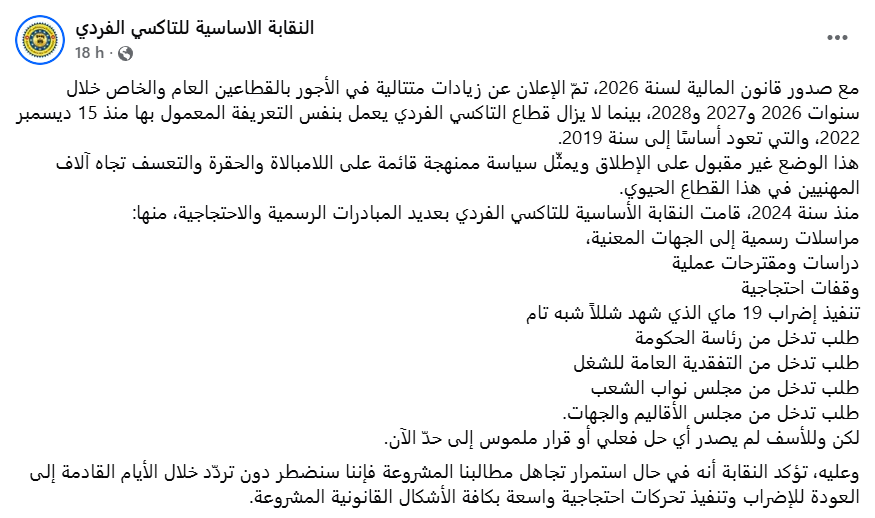 هددت النقابة الأساسية للتاكسي الفردي، بالعودة إلى الإضراب وتنفيذ تحركات احتجاجية واسعة خلال الأيام المقبلة، احتجاجًا على عدم الترفيع في التعريفة النقل المعتمدة منذ ديسمبر 2022، والتي تعود في أصلها إلى سنة 2019، رغم إقرار زيادات متتالية في الأجور بالقطاعين العام والخاص ضمن قانون المالية لسنة 2026”.