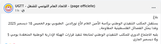 أعلن الاتحاد العام التونسي للشغل أن المكتب التنفيذي برئاسة الأمين العام نورالدين الطبوبي سيستقيل يوم الخميس 18 ديسمبر 2025 وفدا يمثل الفصائل الفلسطينية المقاومة..